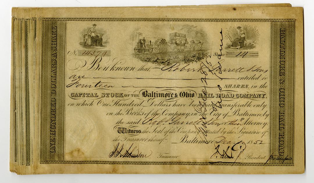 Maryland....., 1852. Group of 20, all the same: Odd Shares I/C Capital Stock Certificate, Black text with black border, Rudimentary locomotive at top center, allegorical women at top left and right. Cancelled in ink or POCs. Fine condition with some toning and staining. Most have sequential serial numbers. (20)