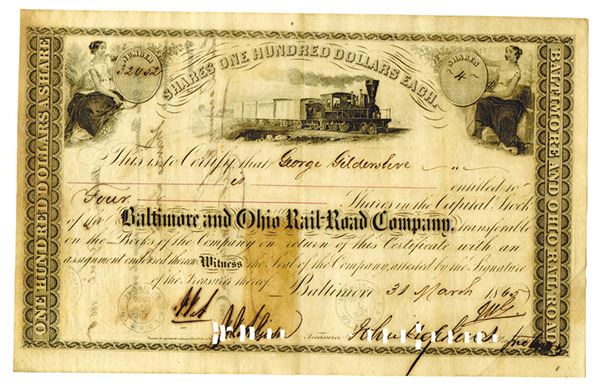 Maryland & Ohio. 4 Shares Capital Stock Issued Certificate, Black print on black border, Locomotive at top with company title at center and allegorical female figures at each top corner, POC's along bottom, Fine condition with staining and toning, Toppan, Carpenter & Co. Signed by John Hopkins the major entrepreneur, abolitionist and philanthropist. He founded many organizations and institutions most notable Johns Hopkins University and Hospital. At the start of the Civil War one of the first campaigns was planned at his home. He continually gave money and use of his railroad to the Union Army.