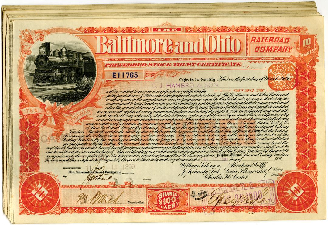 Maryland, 1899. 30 pieces: 12 are Odd Shares I/C Preferred Stock Trust Certificates in orange; 18 are 100 Shares I/C Preferred Stock Trust Certificates in red. All have POCs and/or are handstamp cancelled. Some have adhesive revenue stamps on back. Fine condition, IBC. (30)