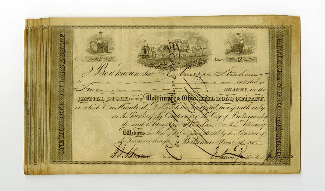 Maryland, 1852. Group of 20, all the same: Odd Shares I/C Capital Stock Certificate, Black text with black border, Rudimentary locomotive at top center, allegorical women at top left and right. Cancelled in ink or POCs. Fine condition with some toning and staining. Most have sequential serial numbers. (20)