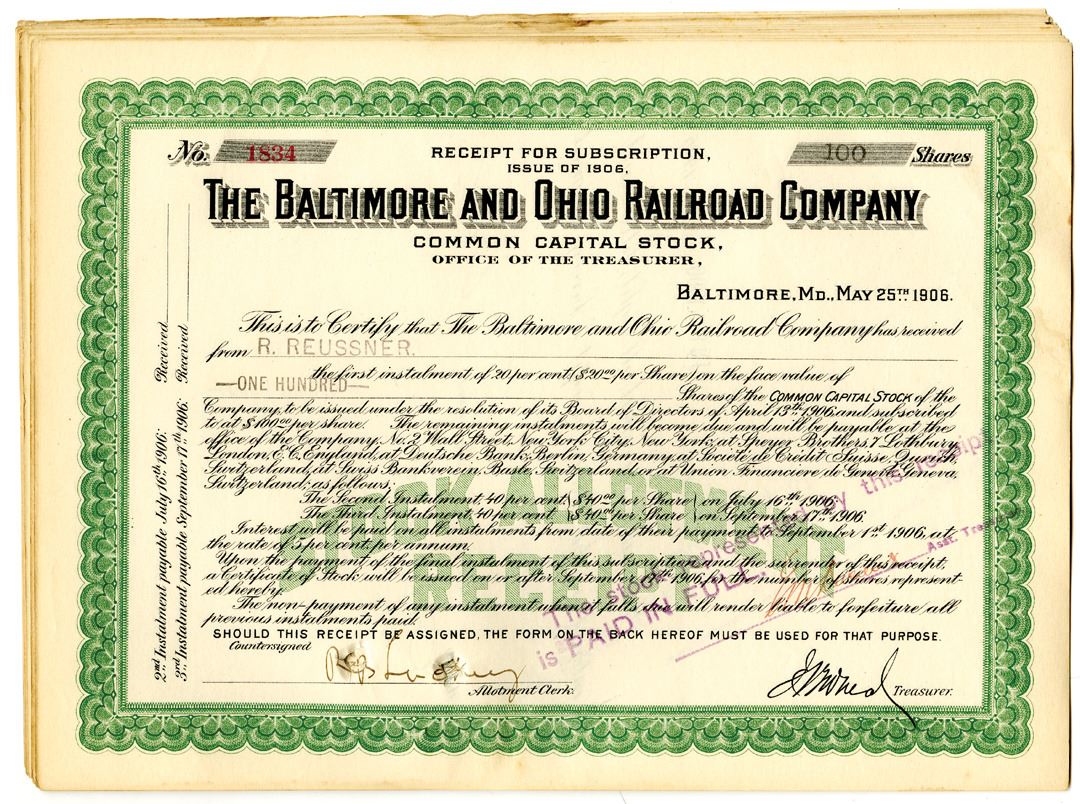 MD. 1906, green, "STOCK ALLOTMENT RECEIPT" underprint, issued, cancelled, most in excellent condition, Lot of 12 certs.