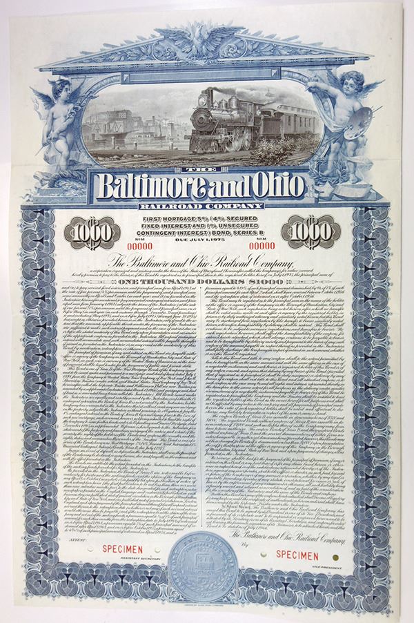 Maryland. $1,000 Specimen 5% Series B 1st Mortgage Coupon Bond, Black print on ornate blue border and under tint, Locomotive at top, Specimen overprints and POC's, VF-XF condition, ABNC.