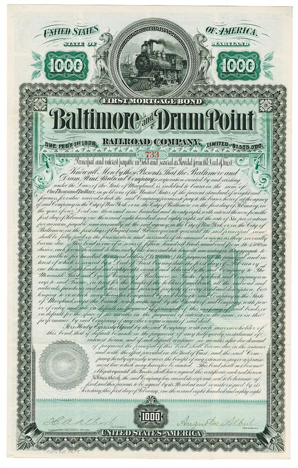 Maryland. $1,000, I/U, 1st Mortgage 6% Gold Coupon Bond, Black on green underprint, Locomotive at top, VF condition. ABNC.