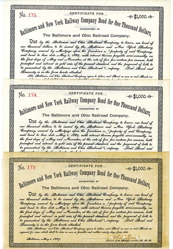 Rhode Island. Group of 3 Bonds all for $1000 Issued and Cancelled 5% 1st Mortgage Gold Bond, All certificates have blue print with a blue border, Company title at top, Certificates are in consecutive order 173,174 and 175, All are punched along right side, VF-XF condition however, certificate 174 has considerably more toning than others, but still in great condition , John Murphy & Co.