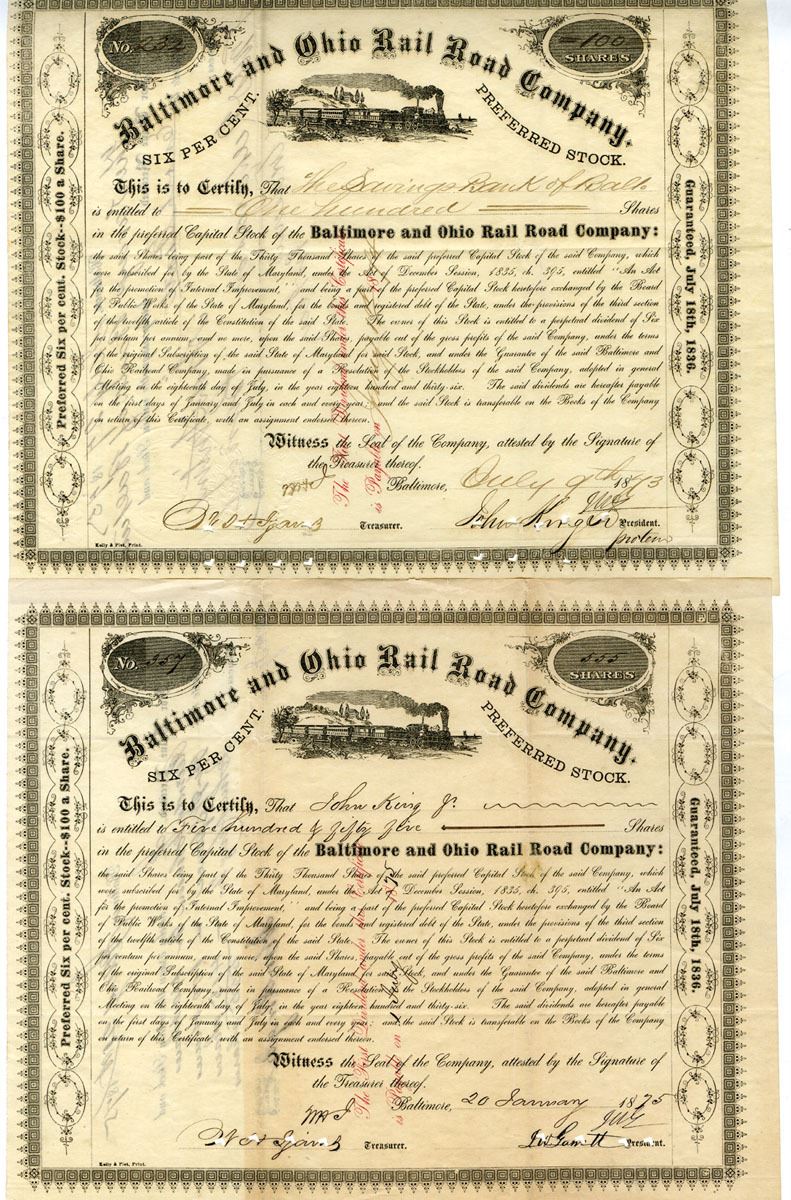 Maryland....., 1873-75. Lot of 2 I/C Preferred Stock Certificates, Black print on black border with company title at top and small image of locomotive in profile underneath, Hand written cancelled across face with POC's along bottom, VF-XF condition, Kelly & Piet, Print. (2). Sold "AS IS" no returns accepted.