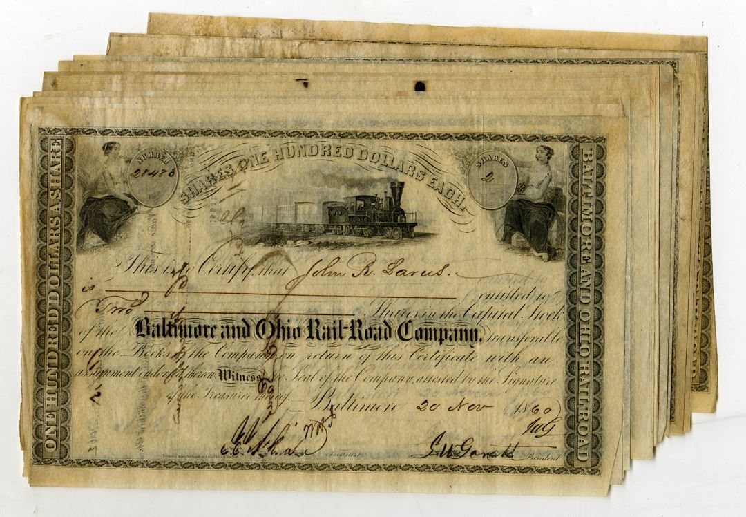 Maryland, 1860. Group of 25 I/C Stock Certificates for various share amounts, Black text with black border. All are in Fine condition.