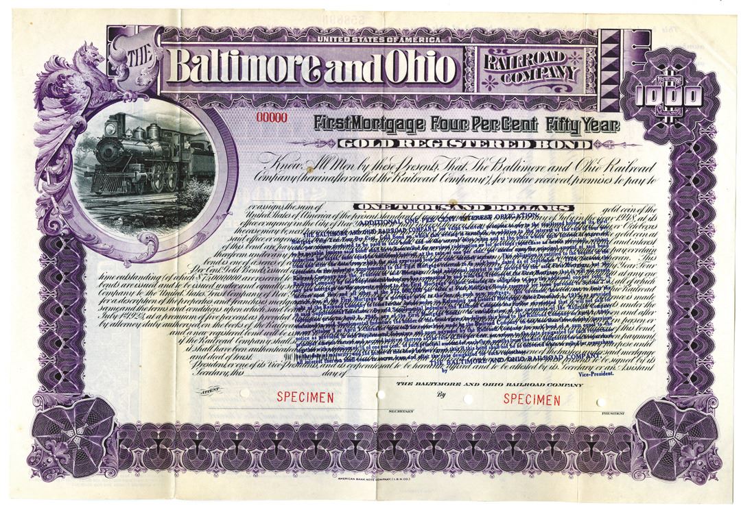 ND (1940s). $1000 Specimen 4% Registered First Mortgage Gold Bond, Black text with ornate purple border and underprint, Scene of locomotive in circular frame at top left corner. Red specimen overprints, 00000 serial numbers, POCs, with large overprint in navy ink. Fine-VF condition, ABNC. Only listed in I/C format in Cox, Very Rare Specimen.