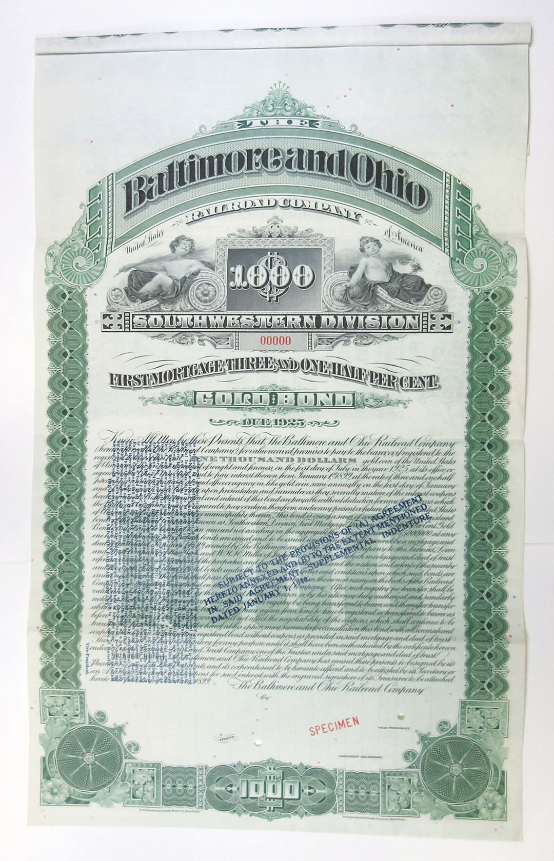 MD, NY, OH. Specimen $1000 vertical format, Prior Lien 3 1/2% (Reissued in 1940 with Interest increased to 5% and Extended to 1950) Gold Coupon Bond, The bond is overprinted on the end panel with Interest rate increase and twice on the face of the bond, Black on green border and underprint, Seated young children flank "1000" denomination counter under title, ornate border, Specimen overprints, POC's, VF/XF condition. IBNC. Only known as Specimen or proof in Cox, no issued examples available and unlisted with "Duplicate" overprint. Unlisted in Cox with extension overprints, and reissued date of 1940 as well as unlisted color. Rare and attractive bond.