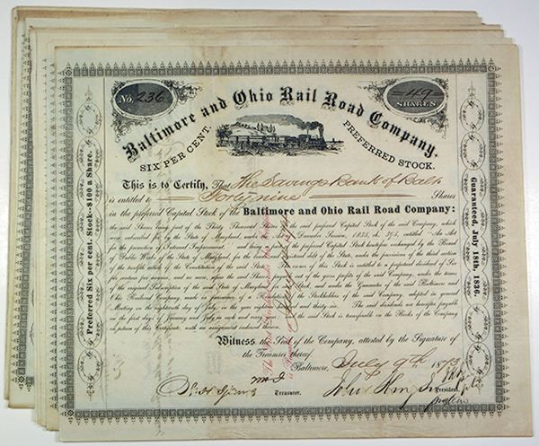 Baltimore, Maryland, ca. 1870s. Group of 25 I/C 6% Preferred Stock Certificates for various Odd Shares. All are in Fine to VF condition. Some are signed by John W. Garrett. He was born in Baltimore, Maryland on 31 July 1820. In 1855, he was elected to the Board of Directors for the Baltimore and Ohio (B&O) Railroad. Three years later, on November 17, 1858, he was elected President of the B&O Railroad - a position he held for 26 years. He was acknowledged by president Lincoln for his help in securing Washington, D.C. from capture by the rebels during the Civil War.