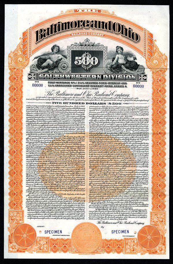 Baltimore and Ohio Railroad Co., Southwestern Division, 1946 Specimen Bond. 1946, $500. Specimen 1st Mortgage 5% (3 1/2% Secured) Series A, Coupon Bond. Coupons attached. VF condition. Specimen overprint and POC's. ABNC. Allegorical young boys or cherubs flank "$500" denomination counter, Orange border and underprint, Unlisted as a coupon bond type and date in Cox. Extremely Rare and attractive railroad bond. ABNC.