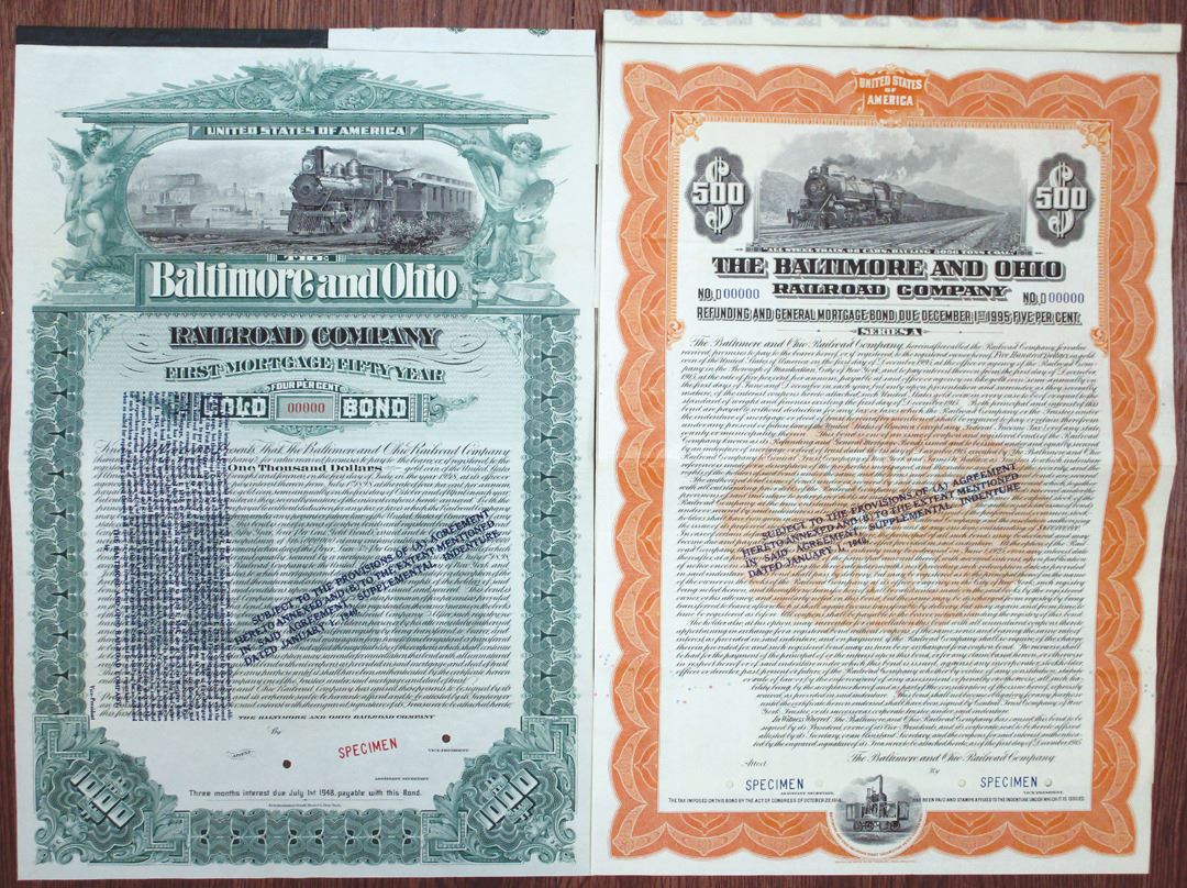 Maryland. 1898 $1000 Specimen 4% First Mortgage Coupon Bond in green; 1915 $500 Specimen 5% Refunding and General Mortgage Coupon Bond in orange. Both have blue overprints, specimen overprints, 00000 serial numbers, and POCs. VF condition, ABNC and IBC. (2)