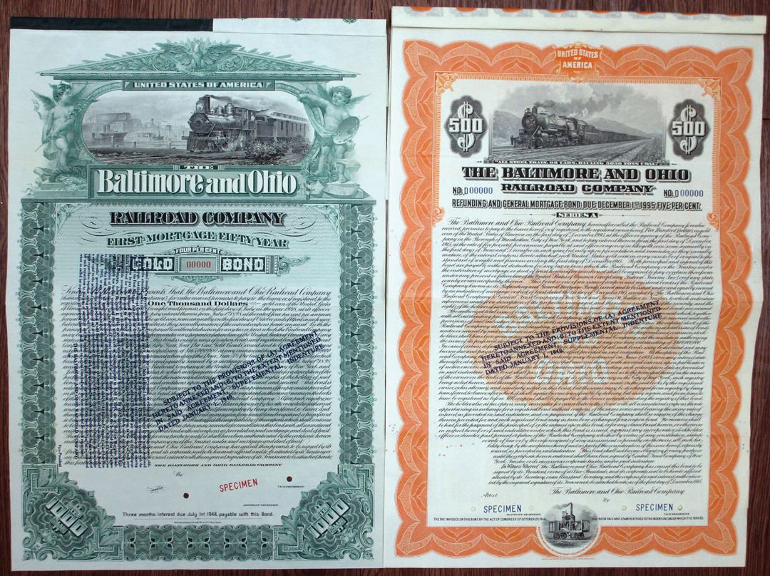 Maryland. Lot of 2 specimen bonds, Includes: 1898 $1000 Specimen 4% First Mortgage Coupon Bond in green; and, 1915 $500 Specimen 5% Refunding and General Mortgage Coupon Bond in orange. Both have blue overprints, specimen overprints, 00000 serial numbers, and POCs. VF condition, ABNC and IBC. (2)