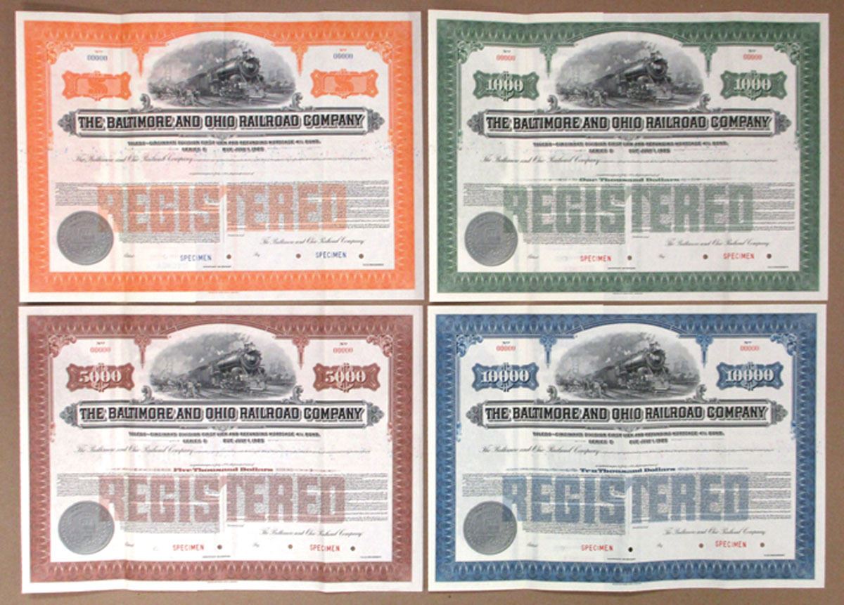 Baltimore, Maryland, ND (1910s). Lot of 4 Registered Specimen Bonds in Various Denominations and Colors: $- in Orange; $1000 in Green; $5000 in Brown, and $10,000 in Blue. All are Toledo-Cincinnati Division First Lien and Refunding Mortgage 4% Bonds with Specimen overprints and POCs, Bonds are in XF to AU condition. ABNC. (4). Sold "AS IS" no returns accepted. The Baltimore & Ohio Railroad (B&O) Toledo-Cincinnati Division connected Toledo and Cincinnati, providing a vital north-south rail link in Ohio. It played a key role in transporting passengers, agricultural goods, manufactured products, and coal, supporting regional commerce and linking Ohio cities to the national rail network. This division contributed to the economic development of Ohio as part of the larger B&O Railroad system.