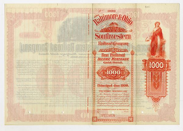 Ohio. Specimen $1000 5% 1st Preferred Income Mortgage Registered Gold Bond. black printing on red border and undertint. Locomotive "89" and another train traveling under signal towers. Horizontal bond. Red specimen overprints and POC's. No coupons attached. XF condition. ABNC. Only 3 found in archives. This is the only one available. Rare bond.