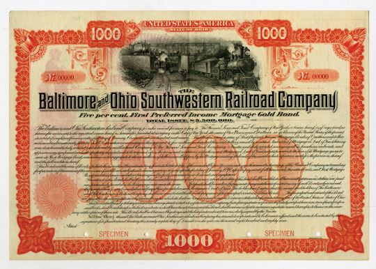 Ohio. Specimen $1000 5% 1st Preferred Income Mortgage Registered Gold Bond. black printing on red border and undertint. Locomotive "89" and another train traveling under signal towers. Horizontal bond. Red specimen overprints and POC's. No coupons attached. XF condition. ABNC. Only 3 found in archives. This is the only one available. Rare bond.
