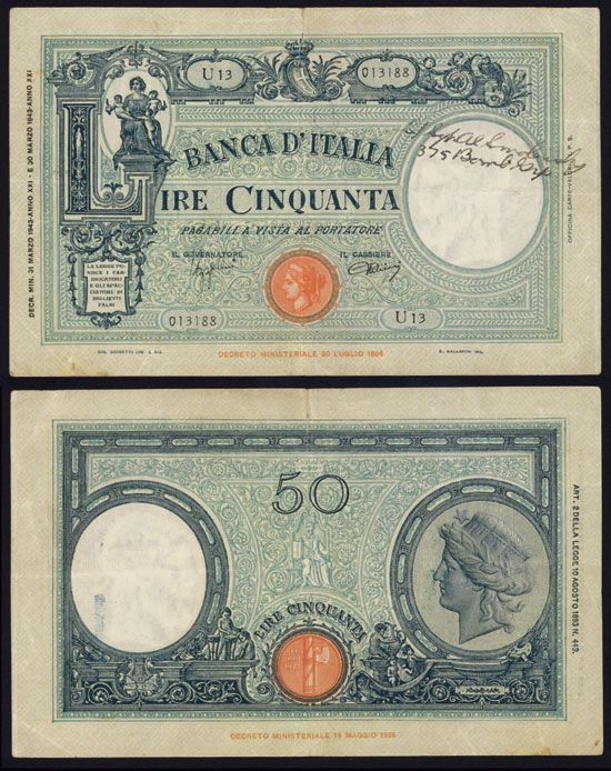 Italy, 1943, 50 Lire, P-64, Choice VF condition, signed on right side of note by (Staff?) Sergeant Al Smolensky, 375 Bomb Group. No other signatures, still a strong military air force connection to this banknote. Sergeant Smolensky flew in a B-24 Liberator bomber in the 375th Bomber group. The 375th Bomb Group was officially transferred to 14th Air Force in China early in 1943. They began flying brand new B-24D Liberators. The squadron arrived in India and made many trips over the 'Hump' between India and China to obtain gasoline, bombs, spare parts they needed to prepare for and sustain their combat operations. The 375th supported Chinese ground forces; attacked airfields, coal yards, docks, oil refineries and fuel dumps in French Indochina; mined rivers and ports; bombed maintenance shops and docks at Rangoon, Burma; attacked Japanese shipping in the East China Sea, Formosa Straits, South China Sea and Gulf of Tonkin. The squadron moved to India in June 1945, ferrying gasoline and supplies from there back into China. The unit sailed for the United States, where it was inactivated on 6 January 1946. Surprisingly historic banknote.