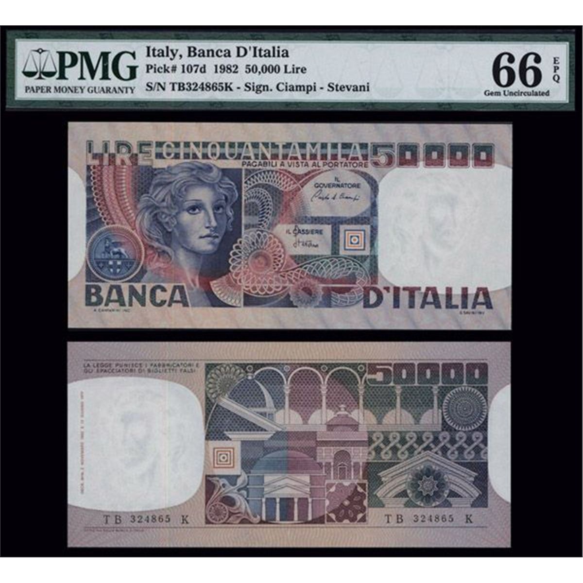 Italy, 1982, 50,000 Lire, P-107d, Issued Banknote, Blue and green on m/c, Young woman and Lion of St. Mark at left, back modern design arches, Signatures of Ciaampi - Stevani, S/N T B 324865 K, PMG graded Gem Uncirculated 66 EPQ (Exceptional Paper Quality), Superb condition and rarer late date only enhance this note, This is the second of 2 sequential serial number notes being offered today.