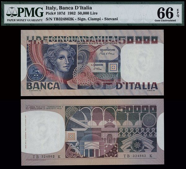 Italy, 1982, 50,000 Lire, P-107d, woman on left with arms, right with watermark, PMG graded Gem Uncirculated 66 EPQ (Exceptional Paper Quality), Exceptional note with scarcer date variety, one of only 5 notes graded by PMG, all at this level with none higher.