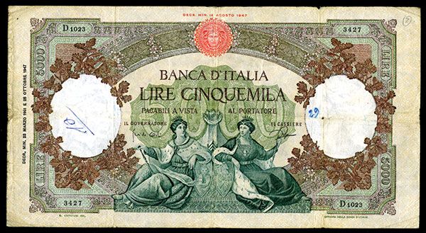 Italy, issued note, 5000 Lire, 1961, P-85d, pleasant Fine condition.