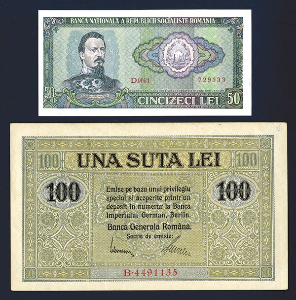 Romania. 100 Lei. ND (1917). P-M7. Nice Very Fine or a bit better. Large format wartime issue; 50 Lei, 1966. Alexander Cuza at left; Palace in Iasi on back. P-96. Uncirculated. 2 pieces.