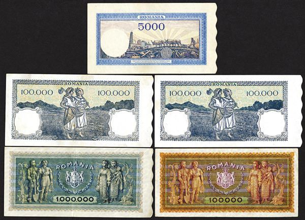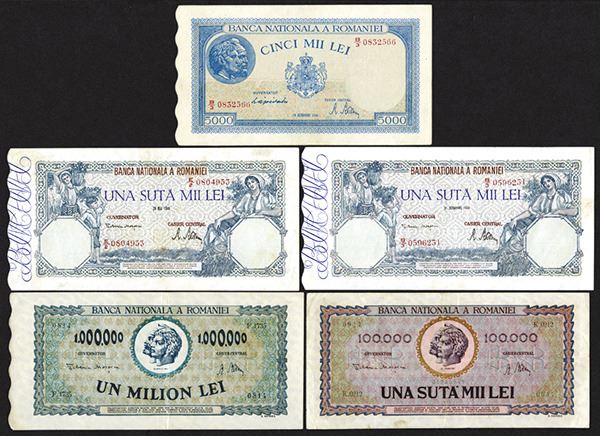 Romania, issued group of notes, includes 5000 Lei, 1944, P-56a, AU; 100000 Lei, 1946 (2 pcs, 1 XF and 1 UNC); 100000 Lei, 1947, P-59; and 1000000 Lei, P-60.