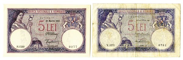 Romania, pair of 5 Lei, P-19a, one dated 2 March 1920, Almost Uncirculated; and the other dated 22 November 1928, Very Fine.