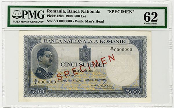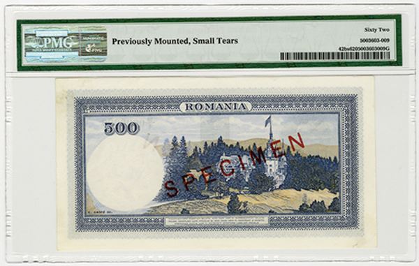 Romania. Specimen 500 Lei, 1936, P-42bs. PMG graded Uncirculated 62 with comment "Previously Mounted, Small Tears." (Cert # 5003603-009).