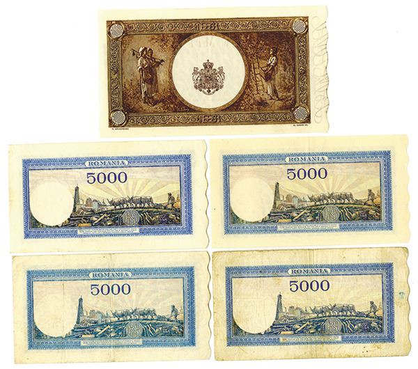 Romania, lot includes 10000 Lei, P-57, Almost Uncirculated; and four 5000 Lei, P-56, Fine to Very Fine condition.