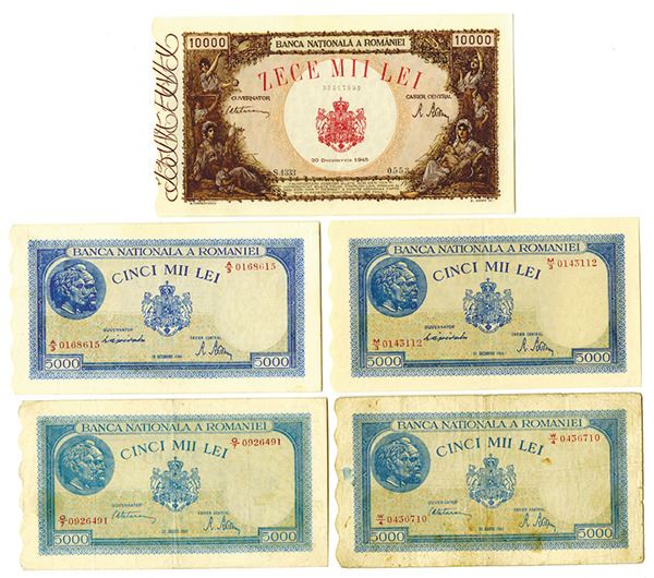 Romania, lot includes 10000 Lei, P-57, Almost Uncirculated; and four 5000 Lei, P-56, Fine to Very Fine condition.