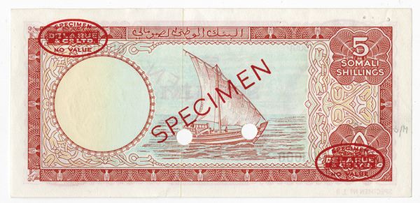 Somalia. Specimen 5 Scellini, 1966, P-5as, Specimen No. 13, TDLR oval overprints. Choice About Uncirculated with staple holes and light pencil annotation.