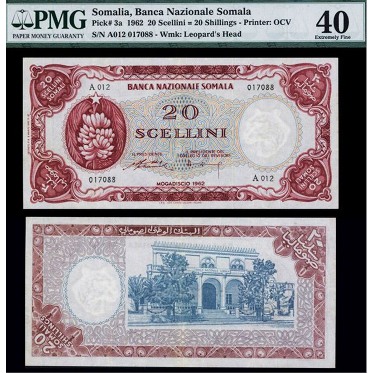 Mogadiscio, Somalia, 1962. 20 Scellini= 20 Shillings, P-3a, issued banknote, Red-Brown on blue and gold underprint, large even margins, PMG graded Extremely Fine 40, bright colors and sharp corners only enhance the appearance of this scarce note in high grade. OCV Printer.