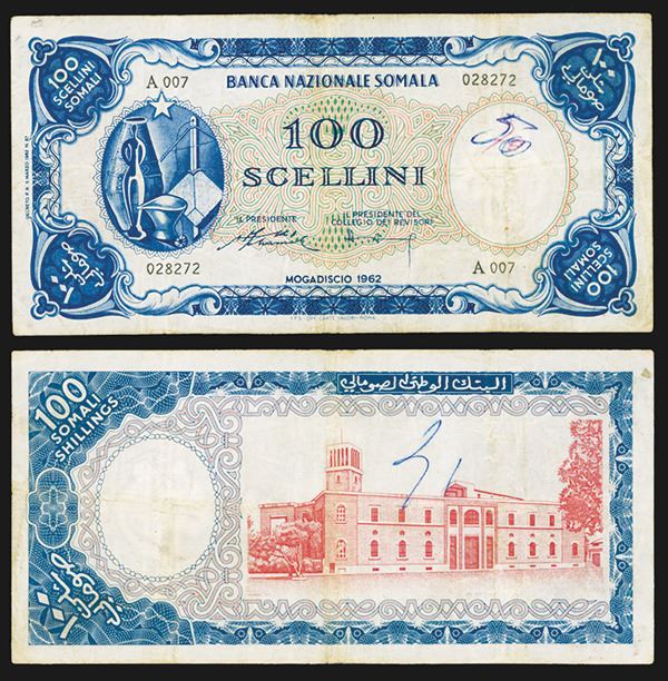 Mogadiscio, Somalia, 1962. 100 Scellini = 100 Shillings, P-4a, issued banknote, Blue on m/c, graffiti on the right front and back of note, large even margins, VF condition with crisp and firm paper quality and bright colors. OCV Printer.