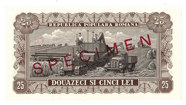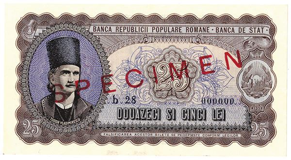 Romania. Lot includes a specimen 25 Lei banknote, with red "SPECIMEN" overprint and s/n b28 000000. P-89s. Gem Unc.