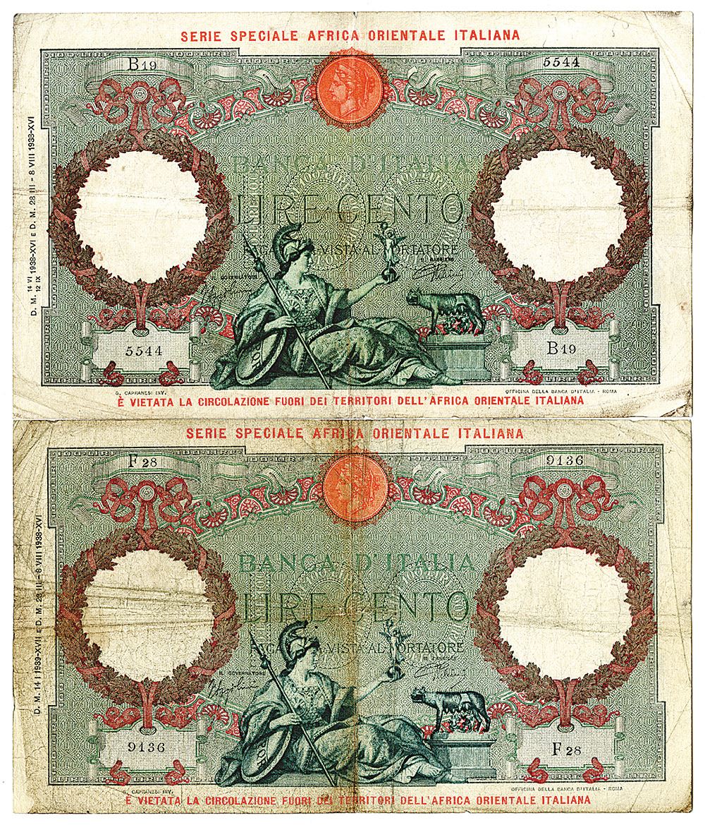Italian East Africa. 1938. 100 Lire, P-2a; 2b, issued banknote, VG to Fine (2). (From the Allen Berk Collection)