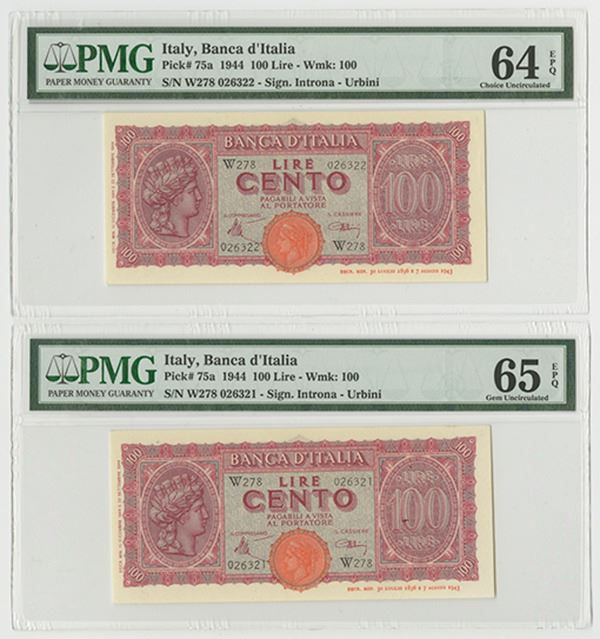 Italy. Sequential pair of issued 100 Lire, 1944, P-75a, S/N 026321-026322. Graded by PMG Gem Unc 65 EPQ, and Choice Unc 64 EPQ, respectively.