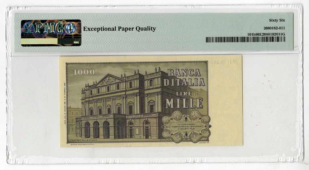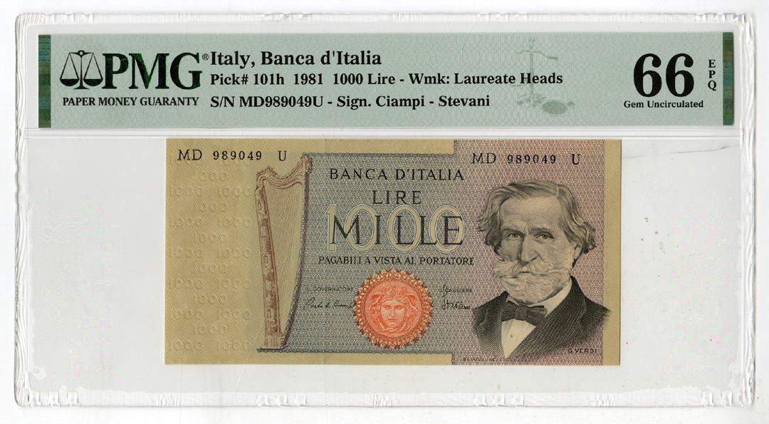 Italy, 1981. 1000 Lire, P-101h, Issued Banknote, Black and brown on light blue and lilac underprint, Harp at left and G. Verdi at right, Back is dark brown with Milan's La Scapa opera house at center, S/N MD989049U, PMG graded Gem Uncirculated 66 EPQ.