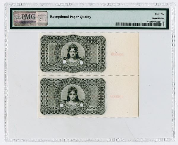 Italy... Specimen 5 Lire, ND (1866-1871), P-Unlisted, uncut vertical pair. Black on blue border and underprint, Back black, PMG graded Gem Uncirculated 66 EPQ (Cert # 8060193-044). BWC.