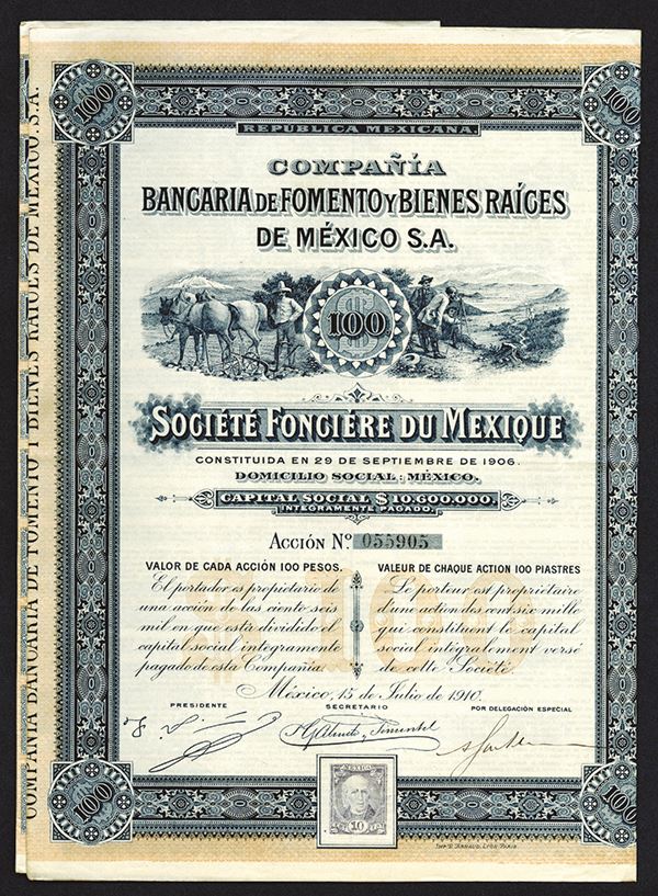 One share, 1910, blue and brown, 100 in circle flanked by farmer and surveyor, EF.