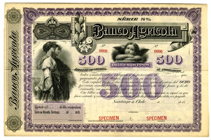 Santiago, Chile, 18xx, (ca.1880-90), 500 Pesos, 8% Issued Coupon Bond, Black on purple border and underprint, Well known image of Reapers at left with Cupid in middle under ornate title with cactus and water jug, F-VF condition, Specimen overprints, POC's. ABNC. Rare Chile bond.