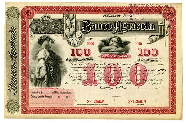Santiago, Chile, 18xx, (ca.1880-90), 100 Pesos, 8% Issued Coupon Bond, Black on red border and underprint, Well known image of Reapers at left with Cupid in middle under ornate title with cactus and water jug, F-VF condition, Specimen overprints, POC's. ABNC. Rare Chile bond.