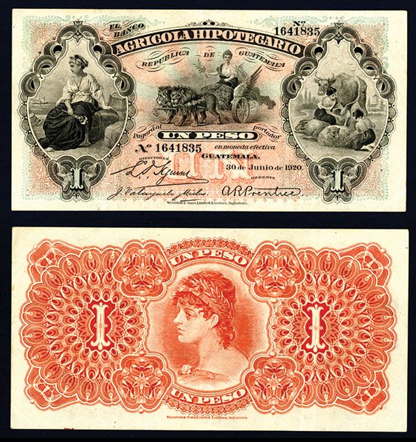 Guatemala. June 30, 1920. 5 Pesos. P-S101b. Issued banknote, Black on pink and blue underprint, Choice XF condition, attractive for grade. W&S.