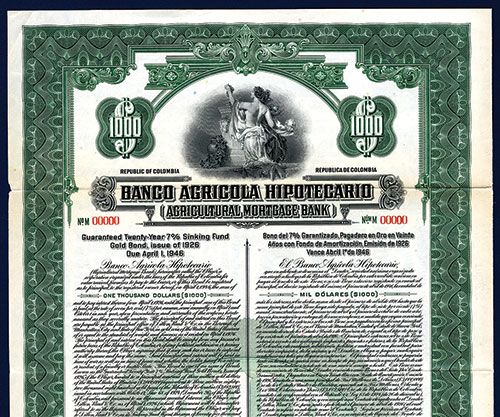 Columbia, 1926, $1000, Guaranteed 20 year 7% Sinking Fund Gold Specimen Bond, Vertical format, Coupons attached, POC's, VF-XF condition, ABNC.