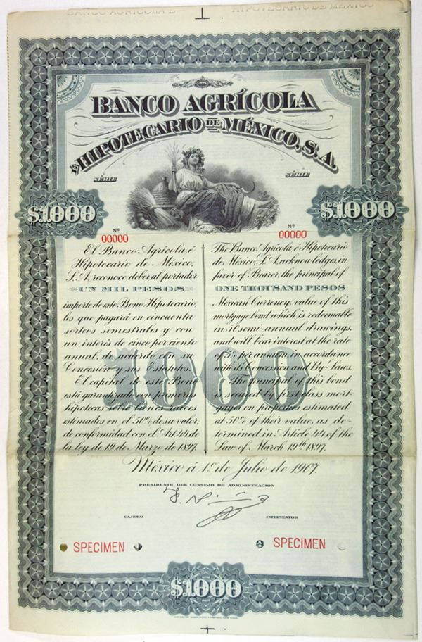 Mexico. 1,000 Pesos Specimen 5% Coupon Bond, Black print on blue border and under tint, Image of allegorical female figure at top, Printed in English and Spanish, Specimen overprints, POC's, VF-XF condition, ABNC.