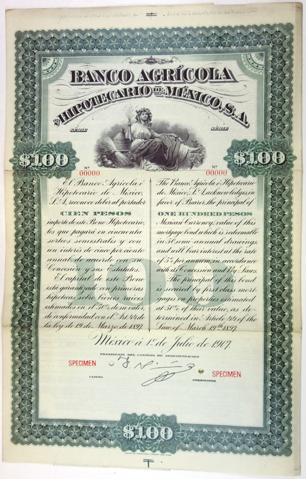 Mexico. 100 Pesos Specimen 5% Coupon Bond, Black print on green border and under tint, Image of allegorical female figure at top, Printed in English and Spanish, Specimen overprints, POC's, VF-XF condition, ABNC.