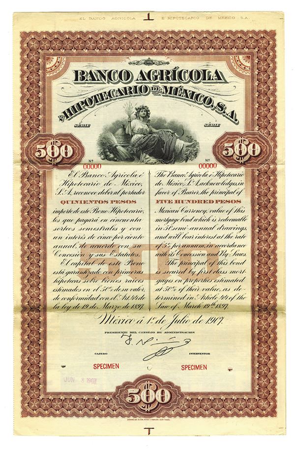 Mexico. 500 Pesos Specimen 5% Coupon Bond, Black print on red/brown border and under tint, Image of allegorical female figure at top, Printed in English and Spanish, Specimen overprints, POC's, VF-XF condition, ABNC.