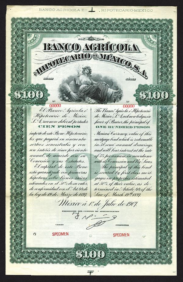 Mexico. 100 Pesos, Mortgage Specimen Bond, green frame, woman with wheat reclines near beehive, ABNC, VF+.