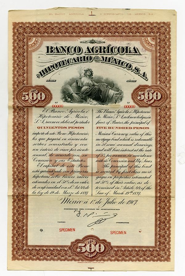Mexico. 1907. 500 Pesos Specimen bond. Brown border and undertint. Seated justice with arms of Mexico. Coupons attached. Red specimen overprint and POC. VF condition. ABNC.