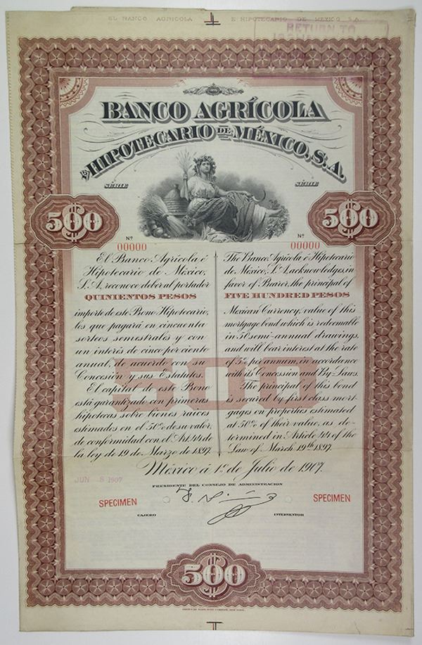 Mexico. 1907. Specimen bond. 500 Pesos 5% Specimen bond. Brown border and undertint. Vignette of reaper with beehive. Red specimen overprint. VF condition. ABNC. Scarce bond.