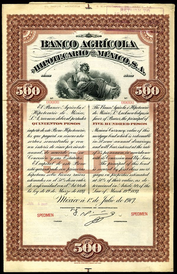 Banco Agricola e Hipotecario De Mexico Specimen Bond. Mexico. 1907. Specimen bond. 500 Pesos 5% Specimen bond. Brown border and undertint. Vignette of reaper with beehive. Red specimen overprint. VF condition. ABNC. Scarce bond.