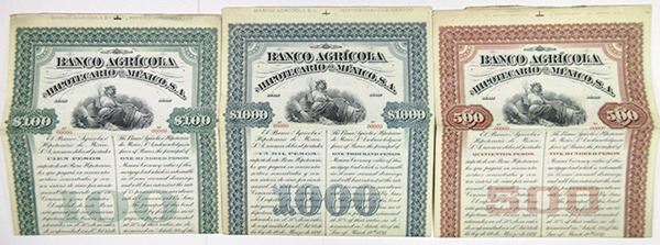 Mexico. Trio of Specimen Bonds. 100 Pesos with green border, 500 Pesos with brown border, and 1,000 Pesos with blue border. All pieces are printed in English and Spanish, have the same vignette of an allegorical woman with a sickle and bunch of wheat, and have Specimen overprints and POC's. All are in Fine-VF condition with toning at edges. ABNC. 3 Pieces.